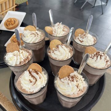 In choc! 6,75 chocolademousse met bosbessen en pistachenootjes