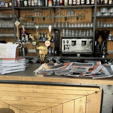 Broodje wie-van-de-brie (vegetarisch) 5,45 wit desembrood met geitenbrie, rode biet, appel en dadelstroop