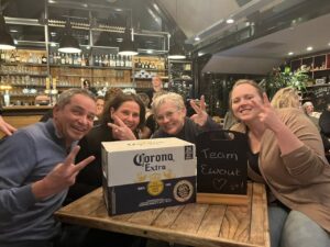 Nummer 2 werd team ‘Ewout’ en in alle rumoer tijdens de prijsuitreiking werd het verhaal achter deze teamnaam niet helemaal duidelijk, vandaar dat ik het hier met goedkeuring van dit team nog even kort herhaal. Normaal is hun teamnaam Melany met Ewout als vast teamlid en voor deze PubQuiz hadden ze in eerste instantie ook zoals altijd 6 personen opgegeven, maar medio januari kreeg ik per mail te horen dat ze dit keer met 4 personen mee zouden doen. Deze avond bleek waarom, op 12 januari is Ewout namelijk uit het leven gestapt en zijn team was vastbesloten om voor hem te gaan knallen en dan het liefst met het halen van de 2e prijs want dat is vaak een bierige prijs. En dit keer hadden ze het geluk aan hun zijde want ipv een 0,75cl fles speciaalbier stond er een sixpack Corona p.p. klaar. Zoals altijd eindigt Peer de PubQuiz met de woorden dat de nummer 2 geen zilver wint, maar goud verliest maar die vlieger ging dus voor team ’Ewout’ echt niet op, dit voelde echt als goud, proost daarboven Ewout